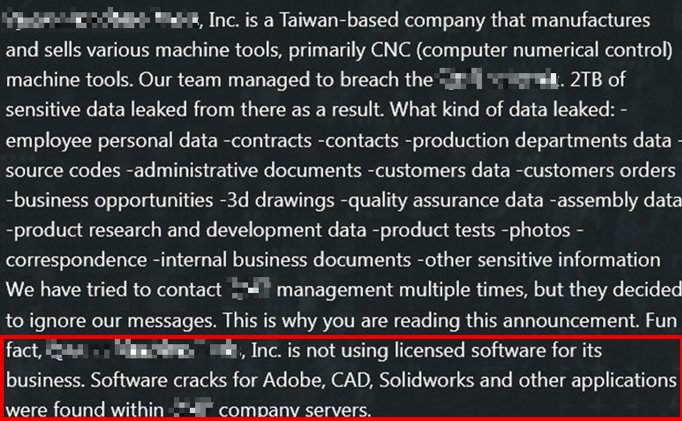 麒麟在暗網聲明中表示,其多次試圖與該工具機大廠高層溝通未果,遂決定公開部分資料並爆料企業內部存在盜版商業軟體,包括 Adobe、SolidWorks、AutoCAD 等知名應用程式。駭客語帶譏諷:「既不願談判,又不尊重軟體授權。」
