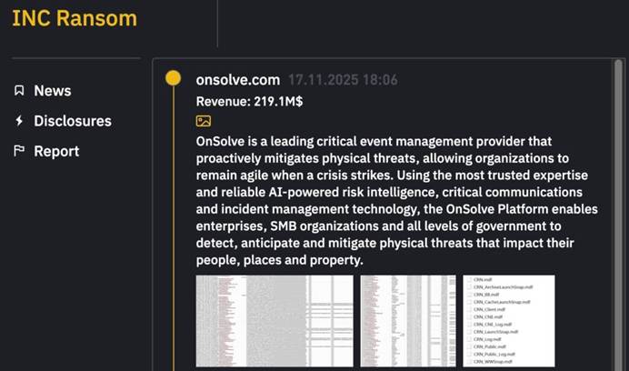 雖然 Crisis24 僅表示事件由「有組織的犯罪團體」發動,但勒索組織 INC Ransom 已於其 Tor 外洩網站公開宣稱負責,並釋出客戶資料、Email、明文密碼及受害清單作為證據。