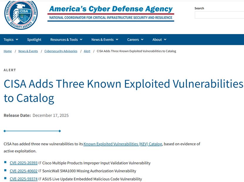 美國網路安全暨基礎設施安全局(CISA)近日更新其 Known Exploited Vulnerabilities(KEV) 目錄,將來自 Cisco、SonicWall 以及 ASUS 的多項重大漏洞正式納入,並明確指出:這些漏洞已被攻擊者用於真實入侵行動中。