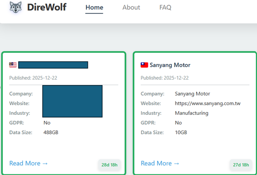 12 月 23 日,該組織於暗網洩密網站(Data Leak Site, DLS)宣稱,已入侵台灣上市公司 三陽工業(Sanyang Motor),並將其列為最新受害者。駭客聲稱竊得約 10GB 的內部機敏資料,內容涵蓋內部文件、財務與法務資料、保密協議(NDA)、資料庫備份、稽核報告、客戶資訊、個資與交易紀錄等,並揚言 27 天後全面公開外洩。