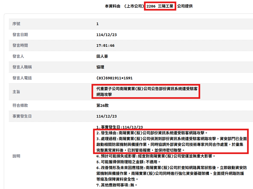 同日,三陽工業亦代其子公司 南陽實業 發布重大訊息,證實部分資訊系統遭受網路攻擊。公告指出,內部即時偵測異常後,已第一時間啟動防禦與備援機制,並結合外部資安專業團隊進行事件應變,完成蒐證報案,並持續與警方合作調查。
