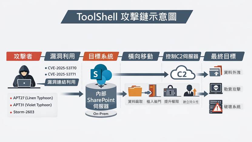 2025 年 7 月,Microsoft 警告 SharePoint On-Premises 遭到鏈式漏洞攻擊(CVE-2025-53770 / 53771),被命名為 ToolShell。