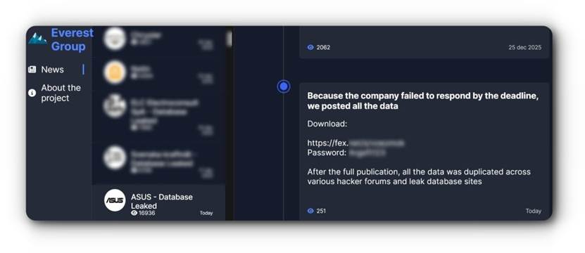 2025 年 12 月 2 日,勒索軟體組織 Everest 聲稱成功入侵華碩(ASUS),並竊取高達 1TB 的內部機密資料,12 月底Everest 將一整批、總量高達 1TB 的華碩內部資料公開於暗網。這並非突發事件,而是一場「早已寫好結局」的勒索流程——