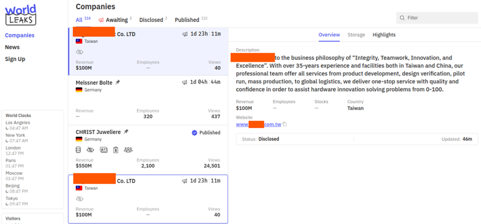 根據竣盟科技B-Lab的情資,在短短一天內,以下台灣企業先後出現在不同勒索集團的洩密頁面上:
