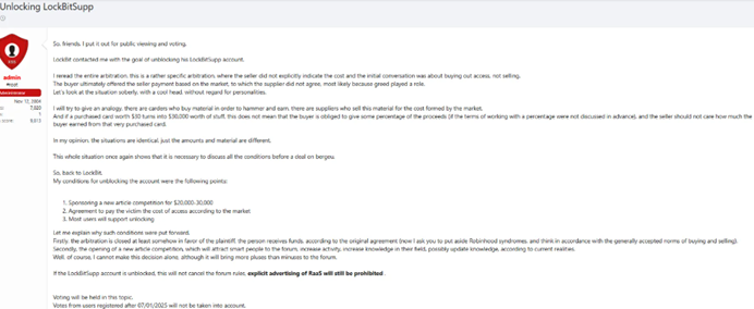 - 重返論壇:LockBit 營運者正嘗試解除在 XSS 論壇的封禁,並發起社群投票,甚至承諾贊助 2–3 萬美元的寫作比賽來換取社群支持。