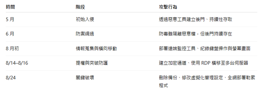 攻擊者在受害環境中至少維持從 2024 年 4 月到 2025 年 9 月的長期滲透,具備高度的隱匿性與持久性。